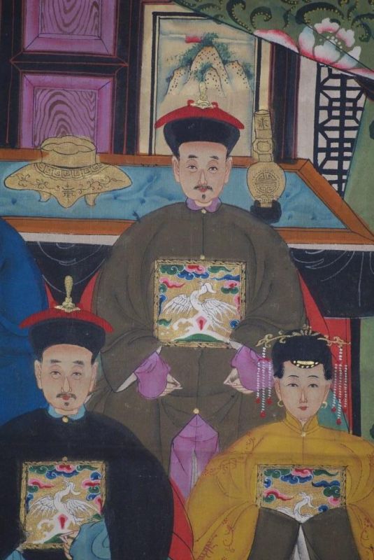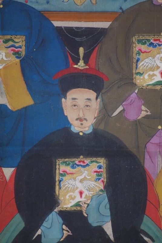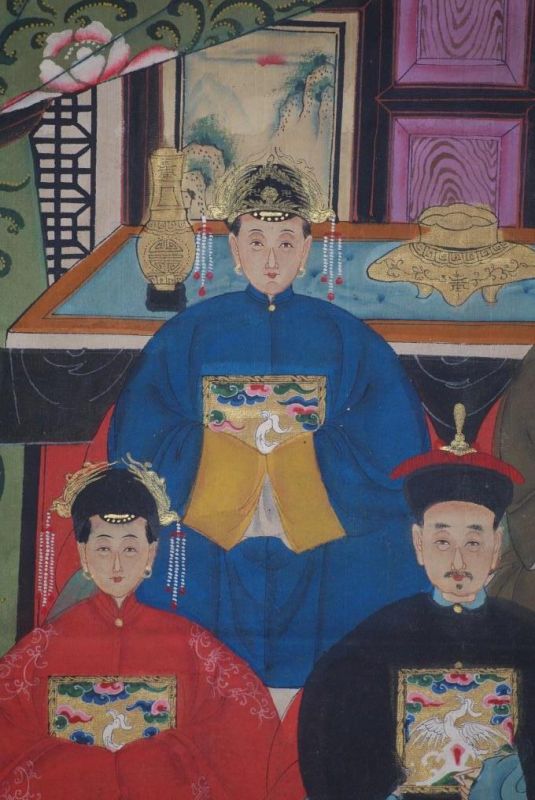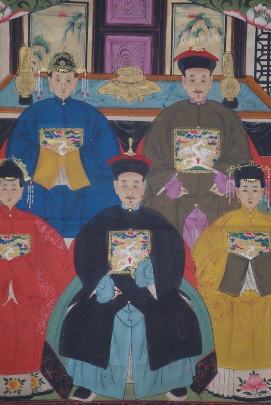 - Les portraits d’ancêtres chinois représentent une personne dans une posture immobile en tenue de fête (robe et chapeau de mandarin) ou en costume de dignitaire ou de fonctionnaire. Ils étaient réalisés par des artistes peintres jusqu’à l’arrivée de la photographie, et les costumes devaient être en rapport avec le rang social de la personne. Ces costumes diffèrent également en fonction des époques, des dynasties et des grades.