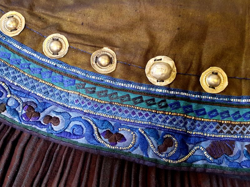 - Les jupes Miao ont 30 à 40 épaisseurs de tissus. Elles sont décorées de brocards éclatants, de broderies élaborées et d’un beau travail au point de croix. Les tissus sont teints au batik, qui consiste à appliquer de la cire à haute températures sur le tissu pour reproduire des dessins – plantes et animaux sont en général les motifs choisis.