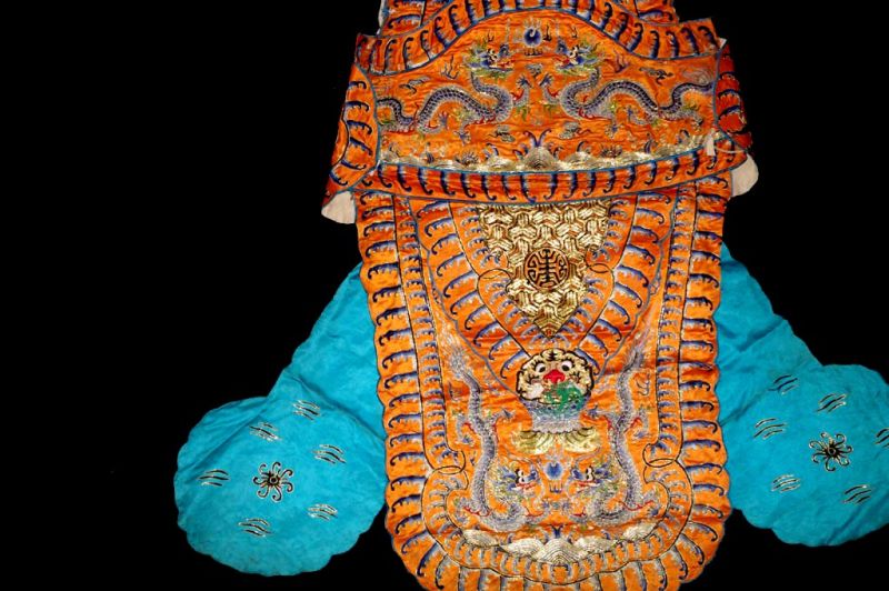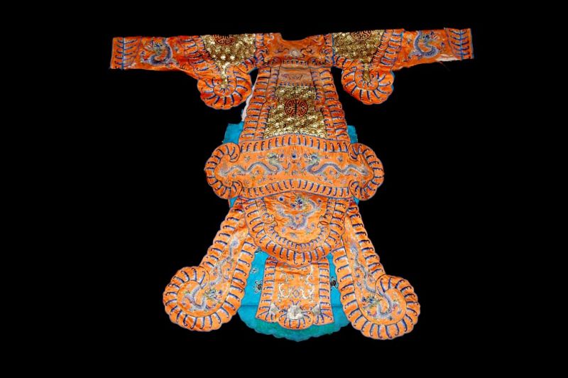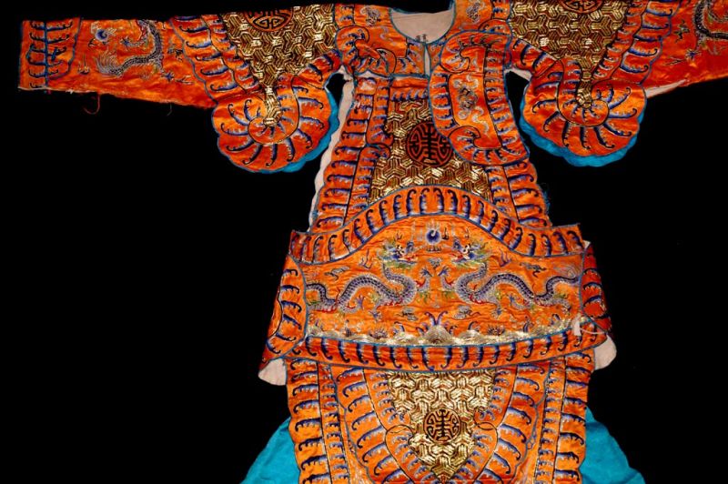 Les costumes traditionnels du théâtre chinois, avec leurs couleurs éclatantes, leurs motifs détaillés et leurs accessoires raffinés, représentent bien plus que de simples vêtements. Ils incarnent des siècles d’histoire, de culture et de spiritualité, et jouent un rôle essentiel dans les performances théâtrales, notamment dans des genres emblématiques tels que l’Opéra de Pékin. Ici nous avons un costume ancien composé de soie et de broderie (environ 70-90 ans). Par la variété des couleurs et par la richesse des ornements, ce genre de costume joue un rôle très important aux yeux du public.