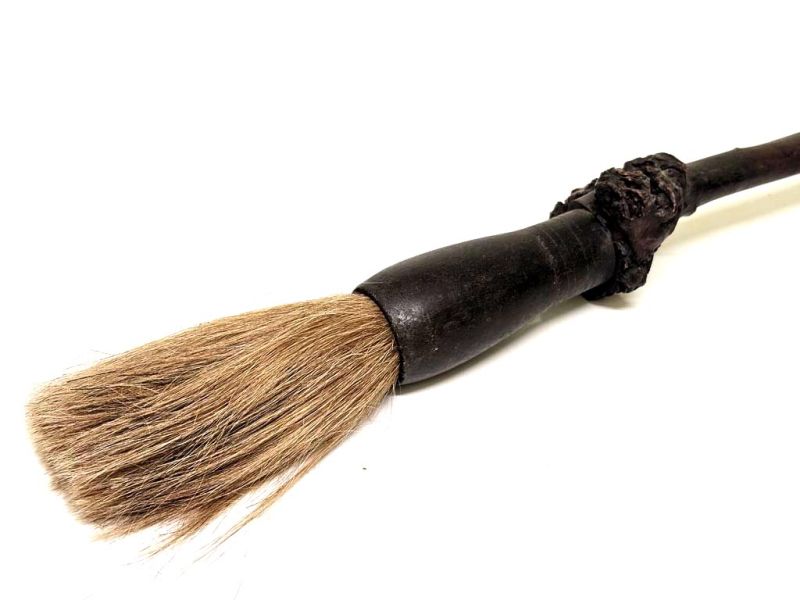 Ce pinceau au manche en bois de cerisier date d’environ 25 ans. Chaque manche est unique, façonné à la main pour mettre en valeur les nœuds et le veinage chaud du cerisier. Le relief naturel du bois, subtilement patiné par le temps, confère à cet objet une présence authentique et raffinée, idéale pour enrichir un intérieur d’inspiration asiatique. La touffe originale, aujourd’hui trop fragile, a été remplacée par du crin de cheval de première qualité. Dense, légèrement souple et d’un brun profond, ce crin s’accorde harmonieusement avec le bois blond rosé du manche. Conçu strictement comme **objet de décoration**, ce pinceau ne convient plus à la calligraphie ni à la peinture, mais se prête parfaitement à l’exposition en vitrine ou sur un bureau de collectionneur.