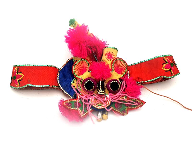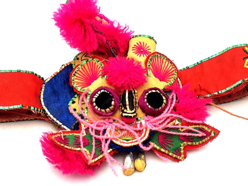 Ancienne Coiffe Ethnique de Bébé - Tête de monstre Heureux - Rouge/Jaune