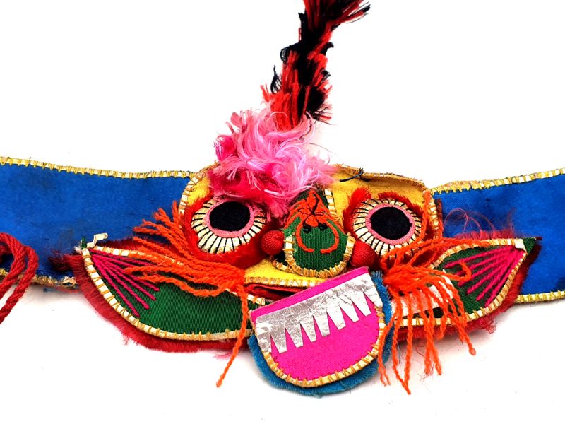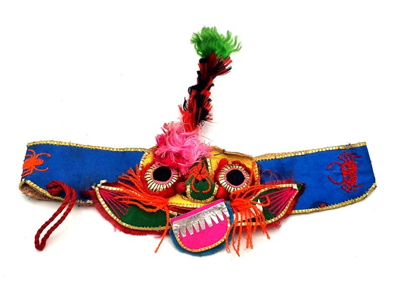 Ancienne Coiffe Ethnique de Bébé - Tête de tigre - Bleu/Vert/Jaune