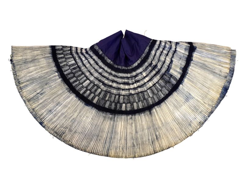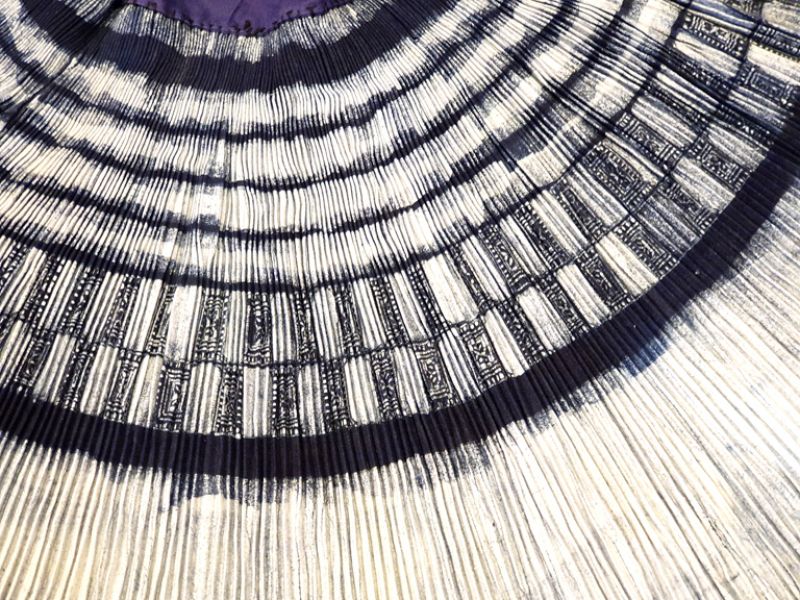 - Les jupes Miao ont 30 à 40 épaisseurs de tissus. Elles sont décorées de brocards éclatants, de broderies élaborées et d’un beau travail au point de croix. Les tissus sont teints au batik, qui consiste à appliquer de la cire à haute températures sur le tissu pour reproduire des dessins – plantes et animaux sont en général les motifs choisis.