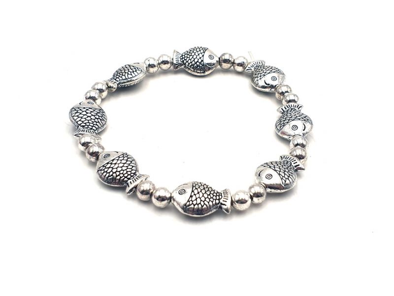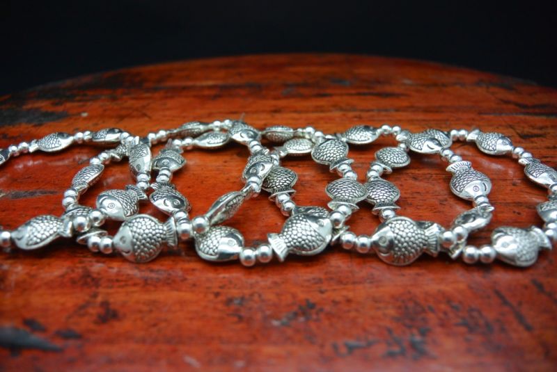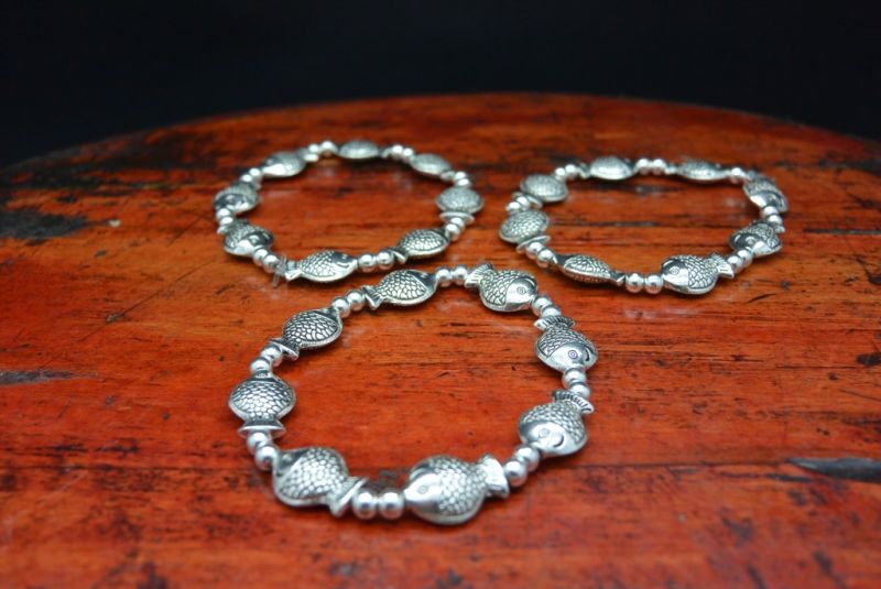 - Petit bracelet ethnique composé de perles de cuivre blanc et argent montées sur un fil élastique. Ce type de bracelet est porté dans tout le Triangle d’or, une région montagneuse d’Asie du sud-est aux confins de la Thaïlande, de la Birmanie et du Laos (cette zone comprendrait également une partie du Yunnan chinois et du Vietnam, selon certaines interprétations). Ce sont principalement les membres de l’ethnie Hmong, également appelée ethnie Miao en Chine, qui fabriquent et qui portent ces bijoux. La tribu Miao est réputée pour ses bijoux ethniques et traditionnels qui sont aisément reconnaissables.