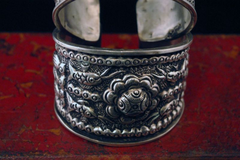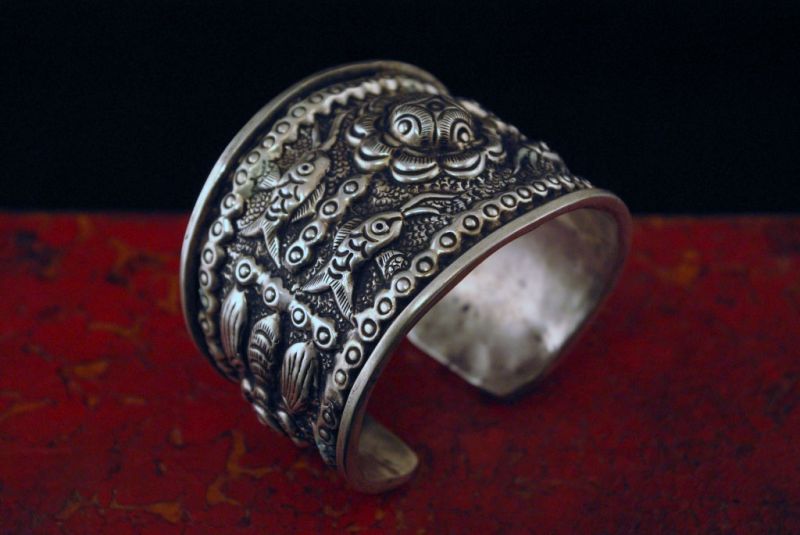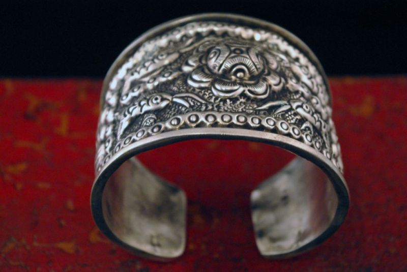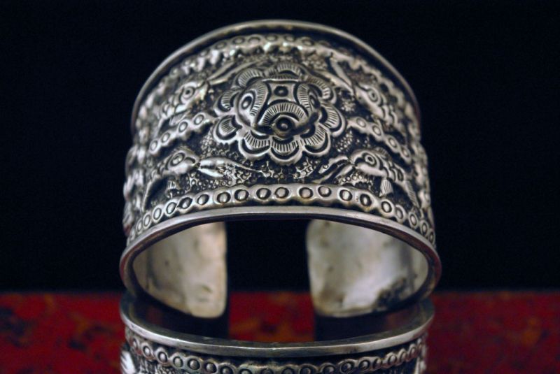 - Bracelet, travail en repoussé (les ornements en relief sont obtenus par martelage). Ce type de bracelet est porté dans tout le Triangle d’or, une région montagneuse d’Asie du sud-est aux confins de la Thaïlande, de la Birmanie et du Laos (cette zone comprendrait également une partie du Yunnan chinois et du Vietnam, selon certaines interprétations). Ce sont principalement les membres de l’ethnie Hmong, également appelée ethnie Miao en Chine, qui fabriquent et qui portent ces bijoux. La tribu Miao est réputée pour ses bijoux ethniques et traditionnels qui sont aisément reconnaissables.