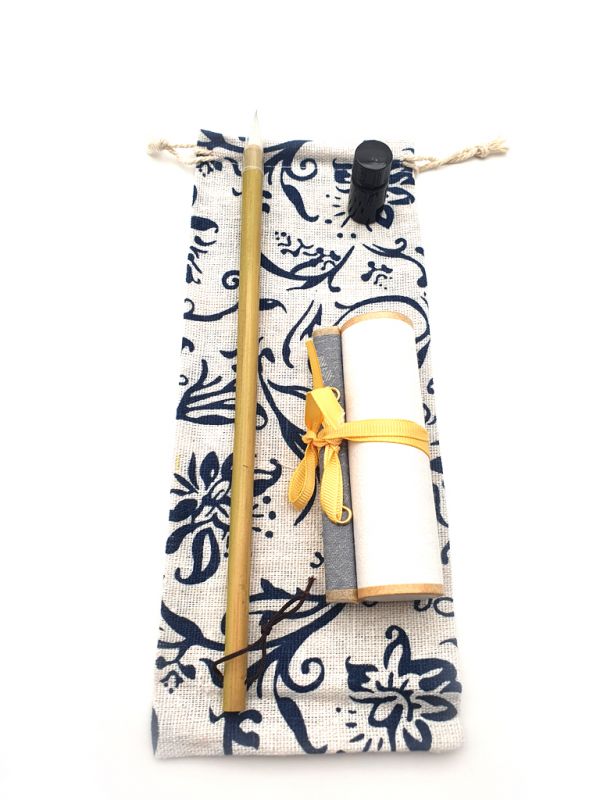 Ce kit est composé d'un kakemono, d'une fiole d'encre de Chine de 3ml, d'un pinceau à calligraphie chinois (poil de chèvre) et d'une pochette en tissus pour le ranger. Idéal pour faire un cadeau.