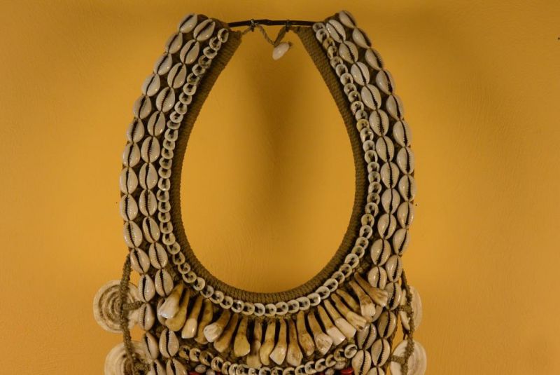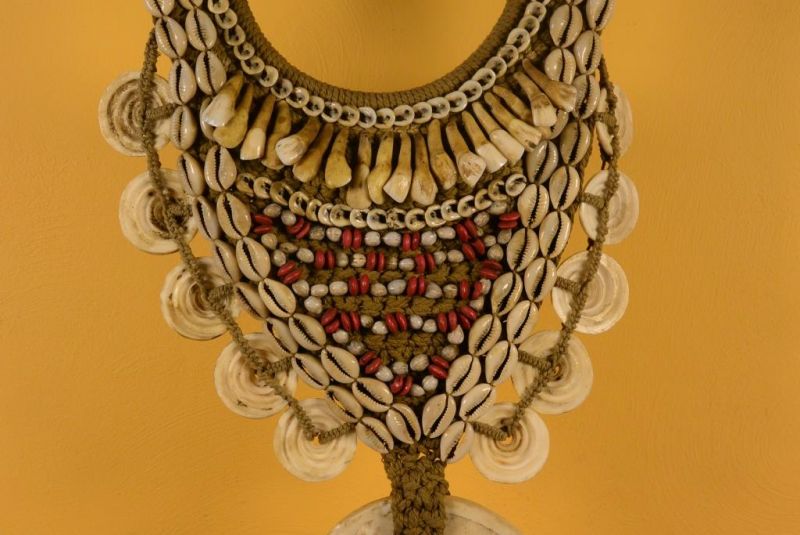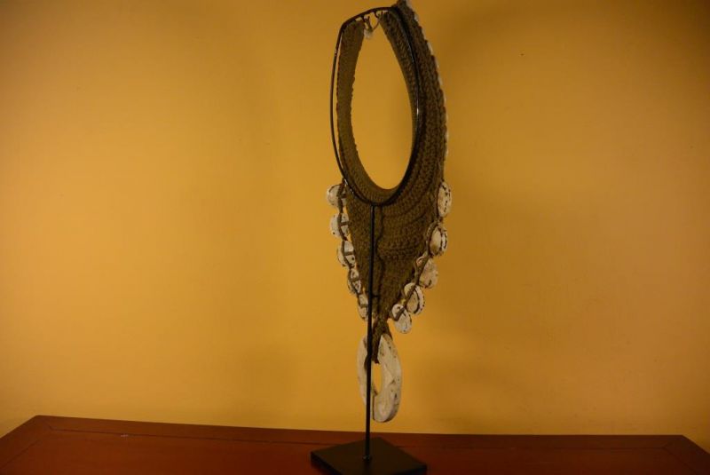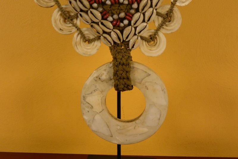 - Collier indonésien en composé de coquillage, corail et perles de bois avec son support.