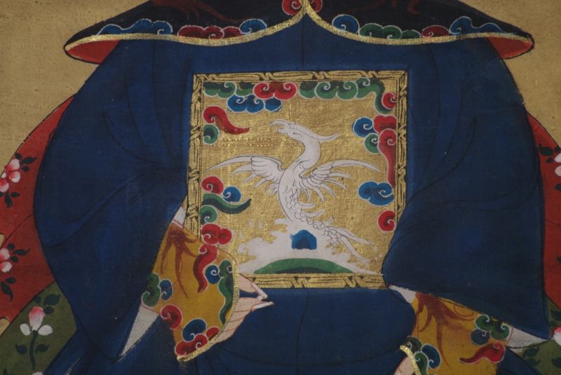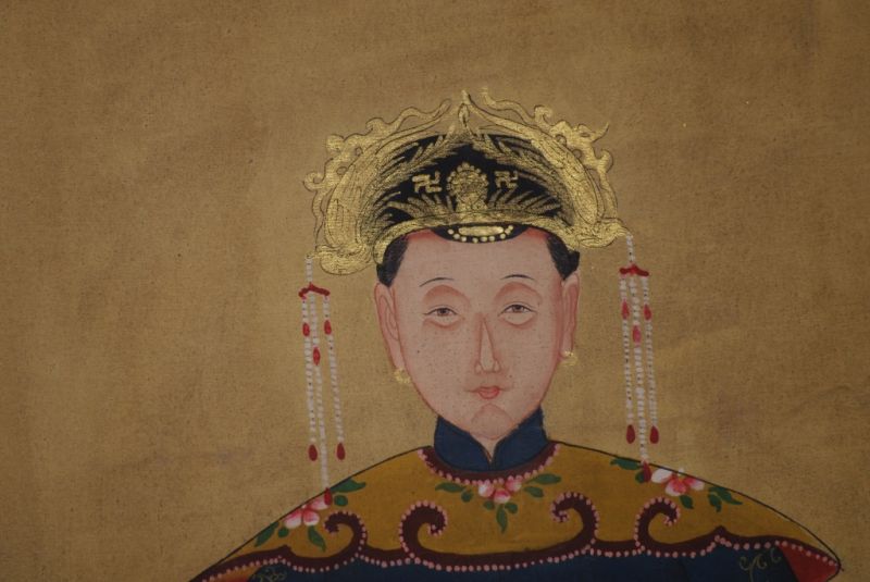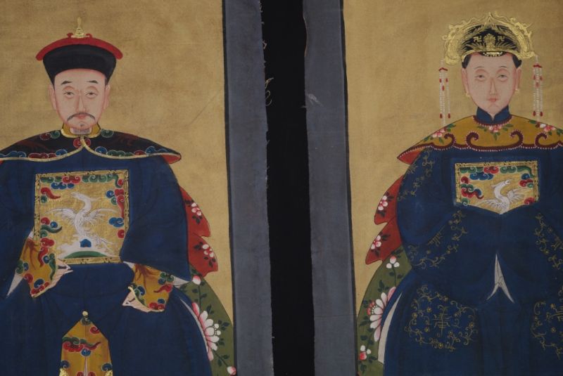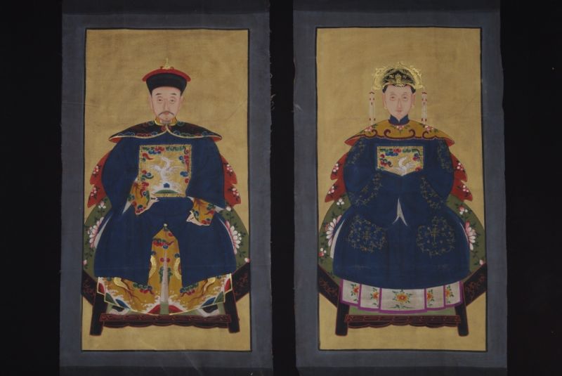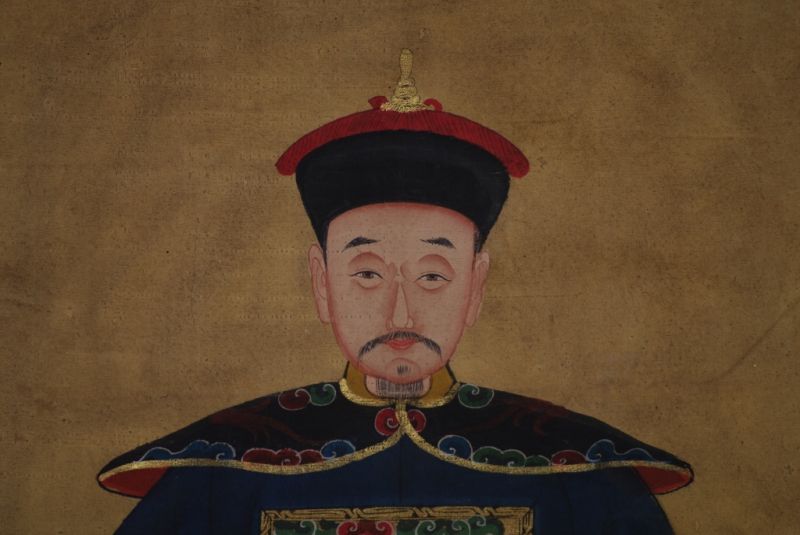 - Les portraits d’ancêtres chinois représentent une personne dans une posture immobile en tenue de fête (robe et chapeau de mandarin).