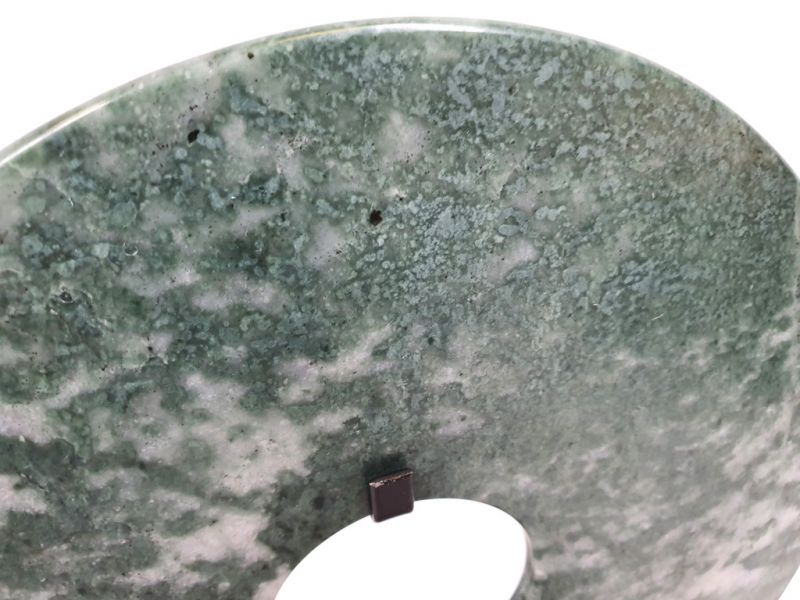 - Il représente le symbole de l’Univers céleste qui est comme lui rond et infini. C’est un artéfact en pierre de type marbre dolomitique opaque également appelé en Asie "Jade de montagne", Ce disque est de couleur naturelle. Il existe de nombreux gisements de Jade de montagne en Chine et cette pierre est utilisée depuis la Préhistoire par les Chinois dans la confection d’objets rituels, d’outils, d’objets artistiques et de potions médicinales.