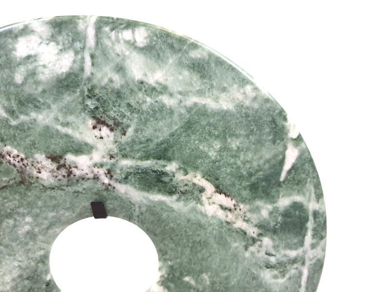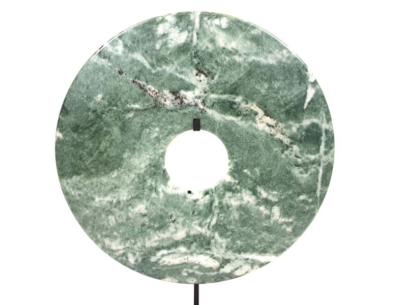 - Il représente le symbole de l’Univers céleste qui est comme lui rond et infini. C’est un artéfact en pierre de type marbre dolomitique opaque également appelé en Asie "Jade de montagne", Ce disque est de couleur naturelle. Il existe de nombreux gisements de Jade de montagne en Chine et cette pierre est utilisée depuis la Préhistoire par les Chinois dans la confection d’objets rituels, d’outils, d’objets artistiques et de potions médicinales.