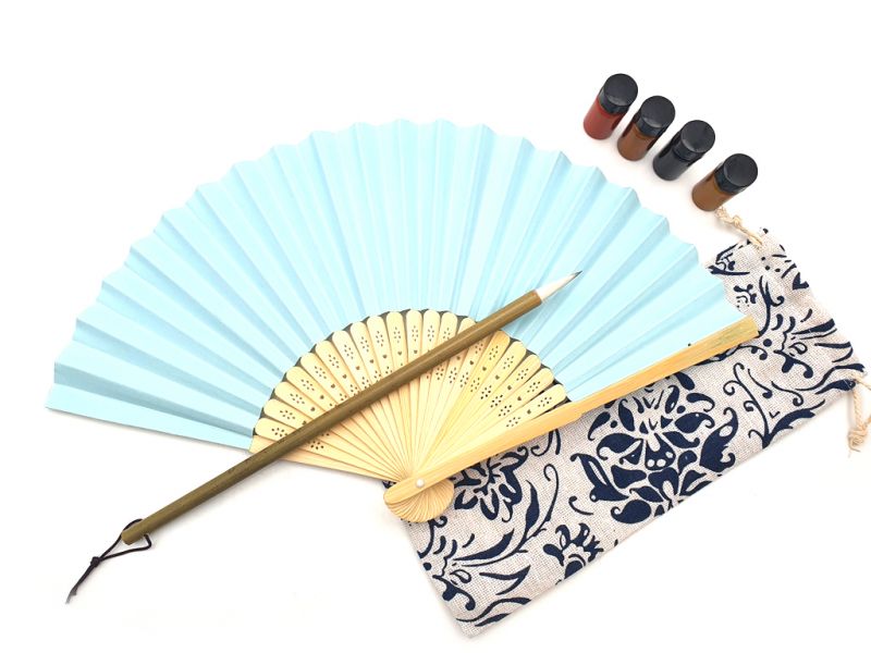 Éventail à peindre - Adulte - Calligraphie chinoise - DIY - Bleu Ciel