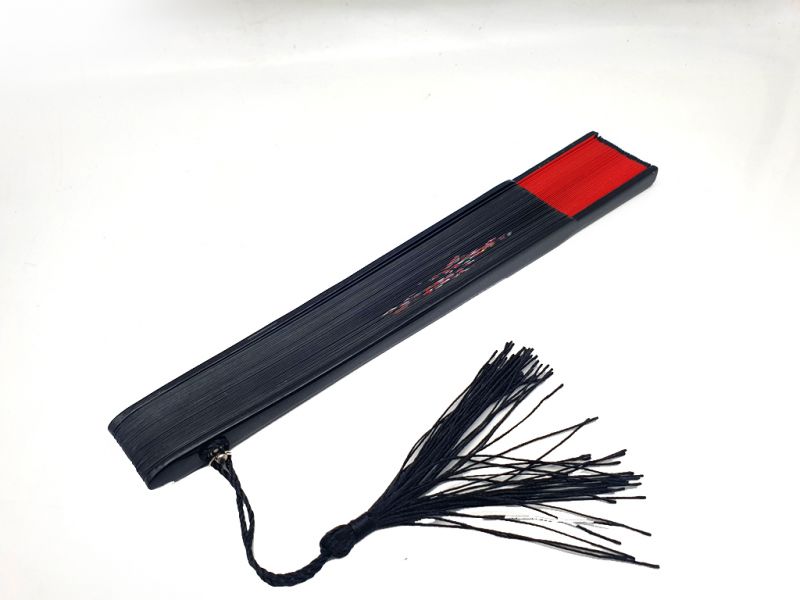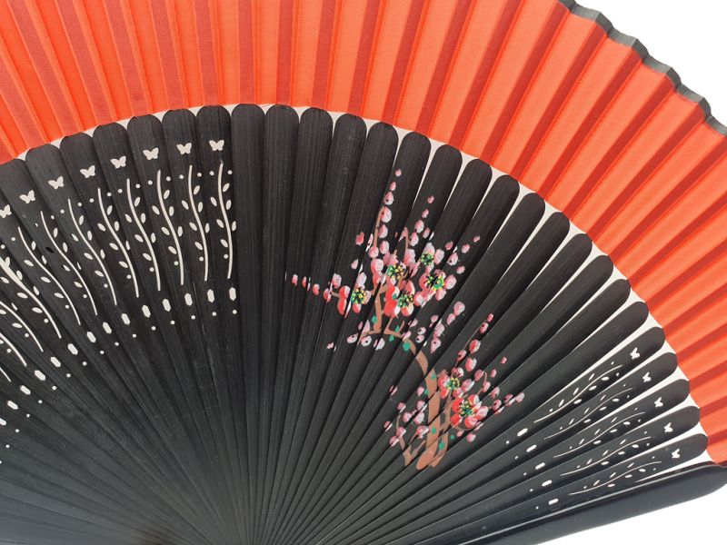 Éventail Asiatique - Peint à la main - Fleurs de cerisier - Noir et Rouge