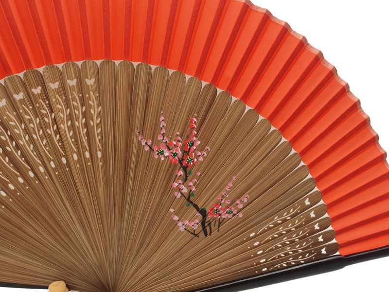 Éventail Asiatique - Peint à la main - Fleurs de cerisier - Rouge et noir