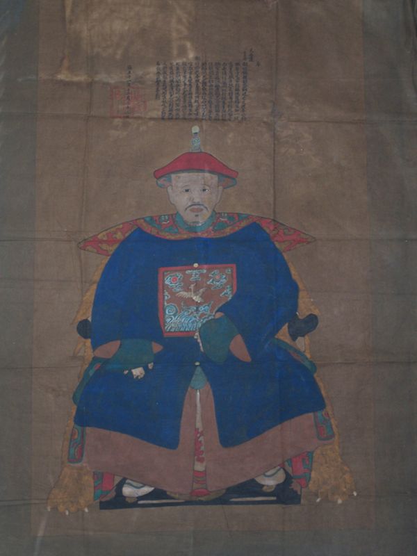 - Les portraits d’ancêtres chinois représentent une personne dans une posture immobile en tenue de fête (robe et chapeau de mandarin) ou en costume de dignitaire ou de fonctionnaire. Ils étaient réalisés par des artistes peintres jusqu’à l’arrivée de la photographie, et les costumes devaient être en rapport avec le rang social de la personne. Ces costumes diffèrent également en fonction des époques, des dynasties et des grades.