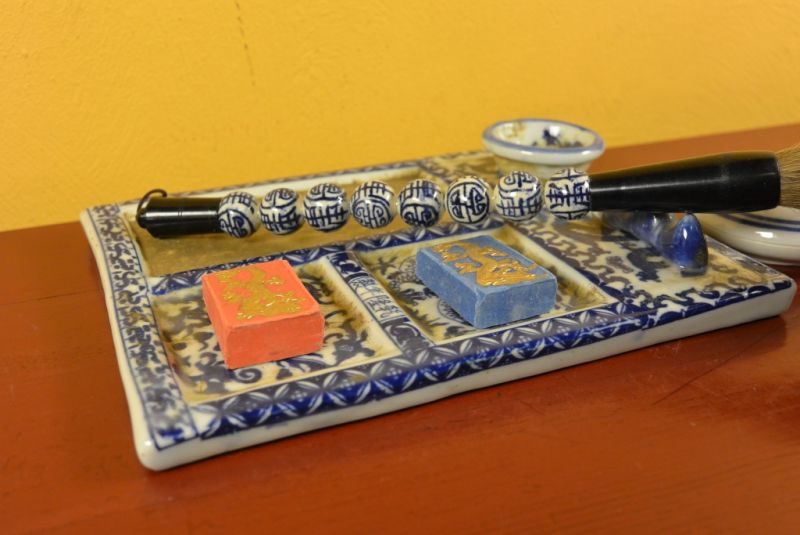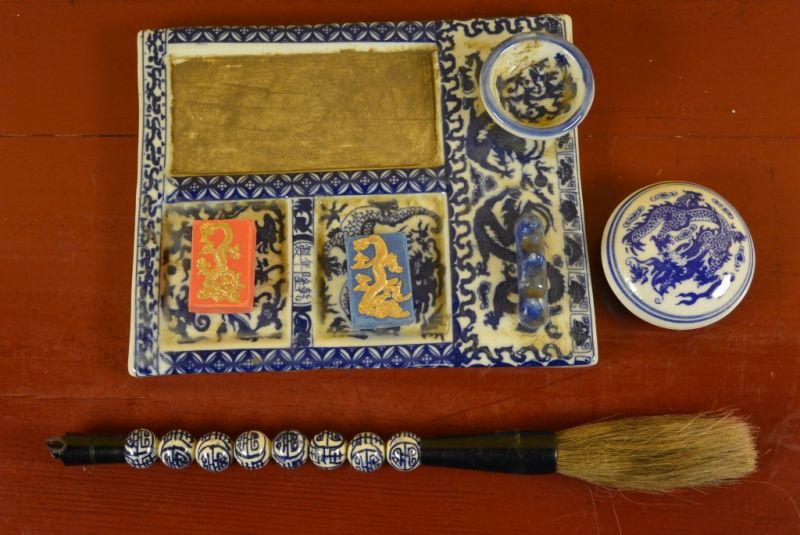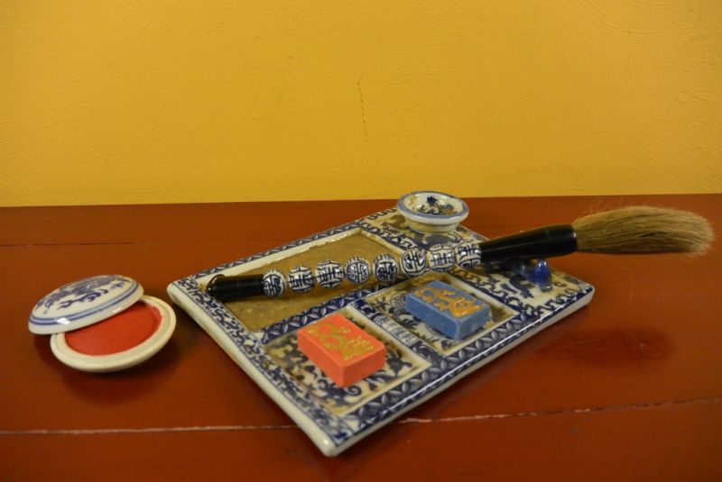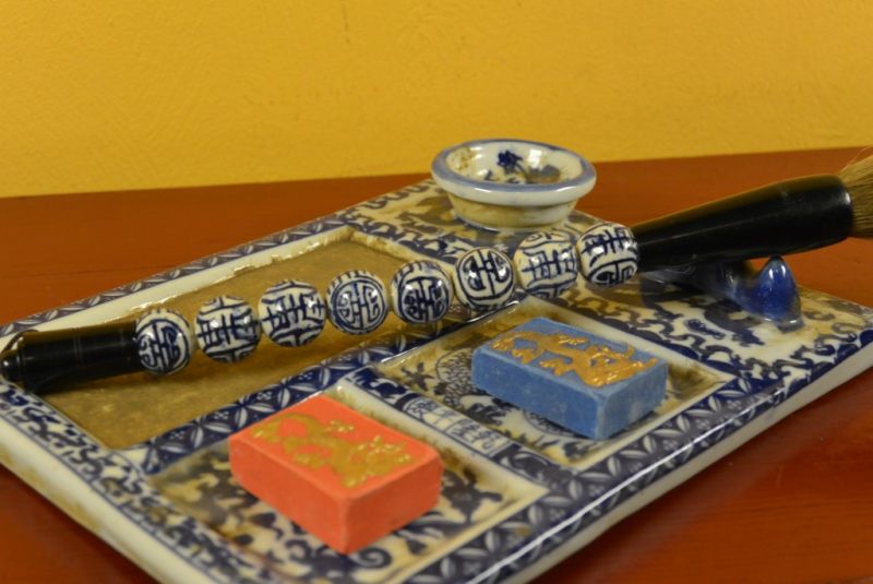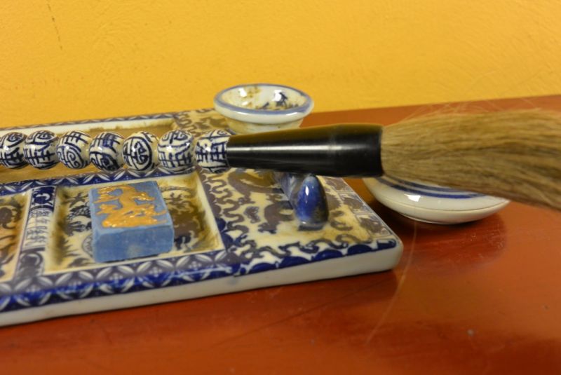 - Kit de Calligraphie chinoise composé d'un pinceau en porcelaine, d'une plaque support en porcelaine et d'une pierre d'encre.