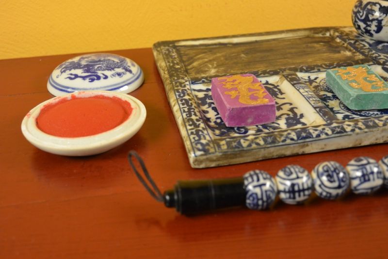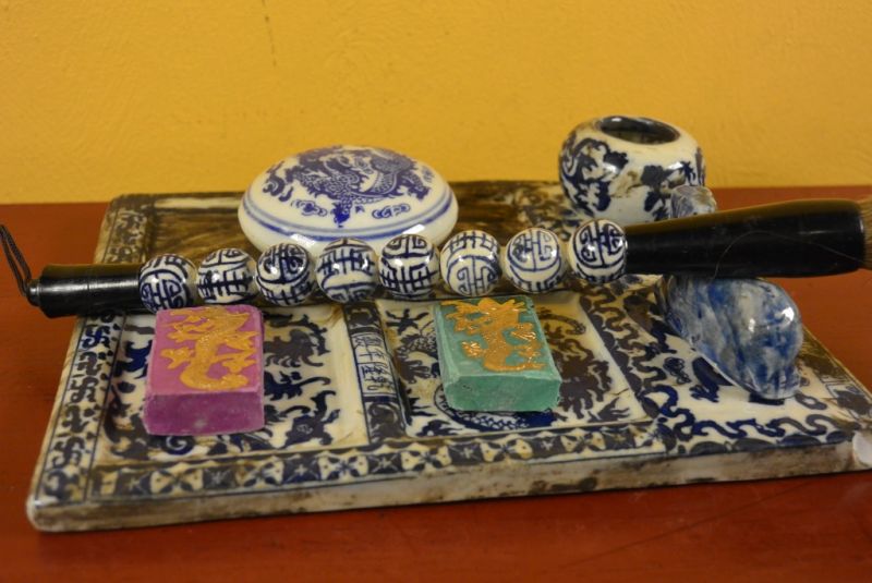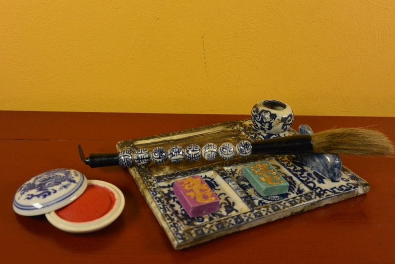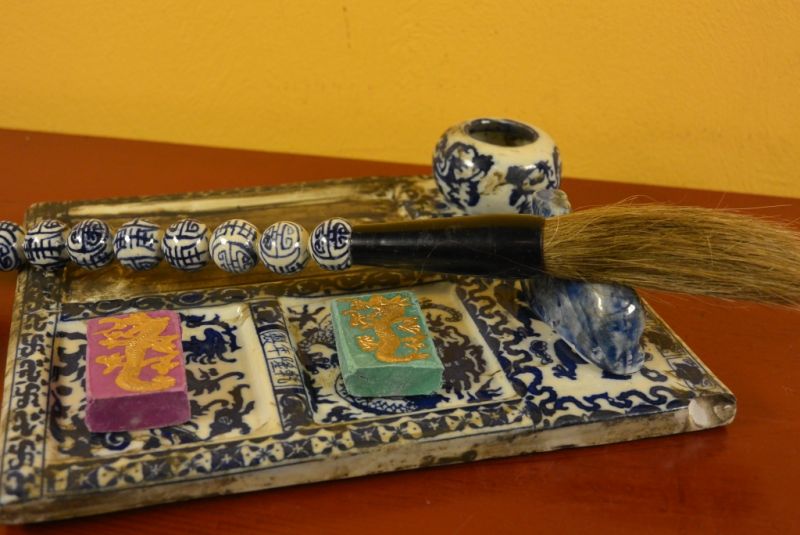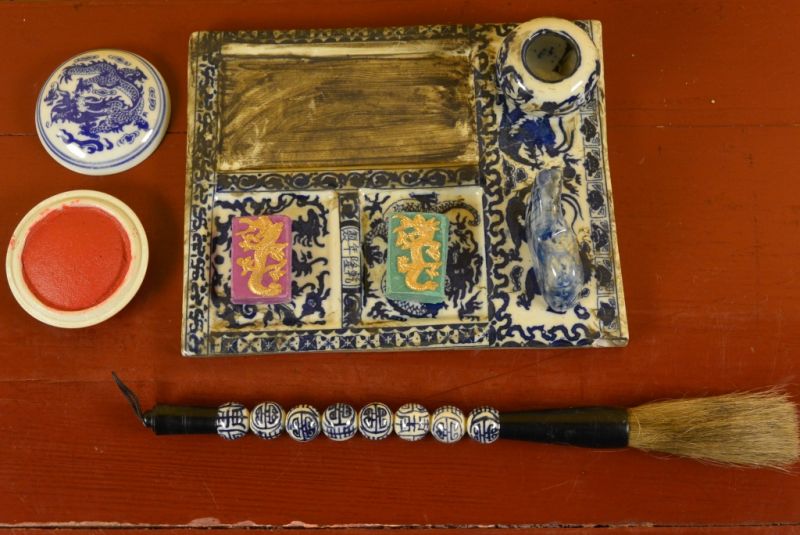 - Kit de Calligraphie chinoise composé d'un pinceau en porcelaine, d'une plaque support en porcelaine et d'une pierre d'encre.