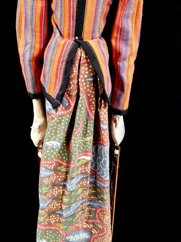- Cette marionnette est confectionnée en bois et est finement ciselé, peint à la main. Bois, batik, broderies et passementerie composent cette marionnette. Les visages, coiffures ainsi que les costumes de ces wayang ont été influencés par la colonisation hollandaise.