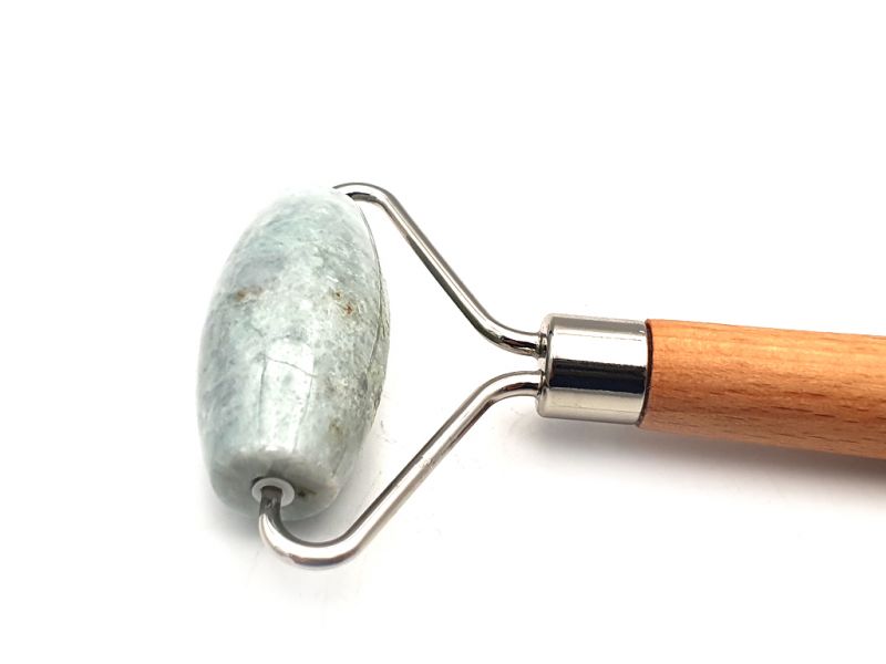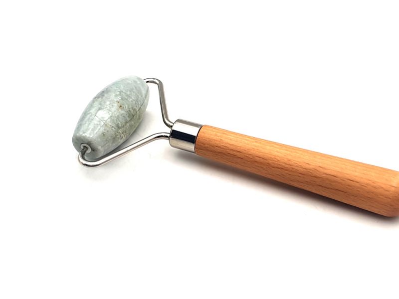 - Jade roller en Jade "type Jadéite" de type A. Ce roller est composé d'un manche en bois, d'une partie métalique et d'une pierre de jade, taillée dans une pierre de très bonne qualité.