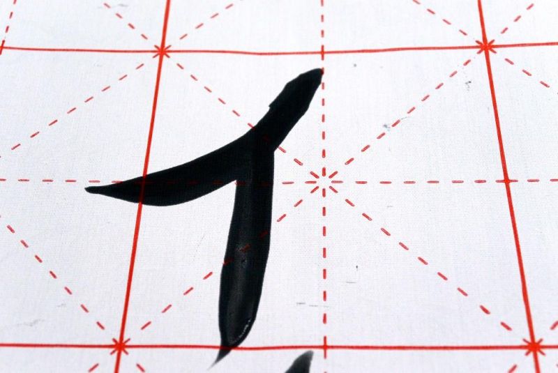 Pour créer de l’encre de Chine liquide, le calligraphe frotte un bâtonnet sur la partie supérieure de sa pierre à encre pour le broyer. Il tient le bâtonnet d’encre à la verticale, effectue des mouvements circulaires et ajoute un peu d’eau. Pour obtenir la densité qu’il souhaite, le calligraphe doit doser parfaitement le frottement du bâtonnet et le volume d’eau. C’est de cette façon qu’il peut créer différentes nuances d’encre noire.