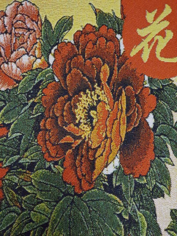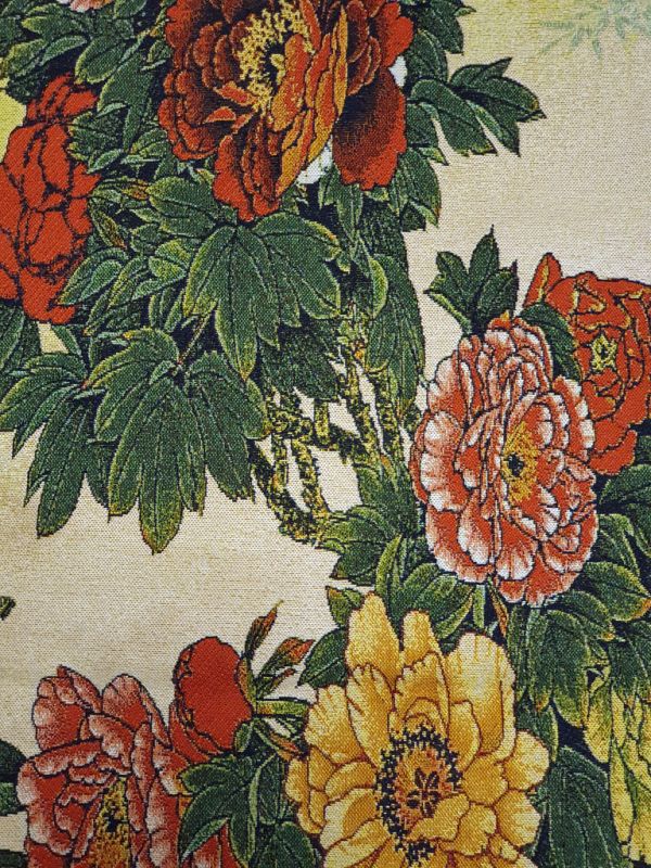 - "Peinture" réalisée en broderie, broderie sur tissus, réalisée en machine, le fil utilisé pour cette broderie est composé à 10% de soie.