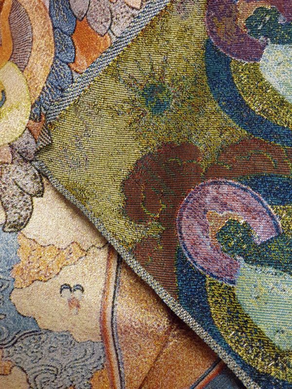 - "Peinture" réalisée en broderie, broderie sur tissus, réalisée en machine, le fil utilisé pour cette broderie est composé à 10% de soie.