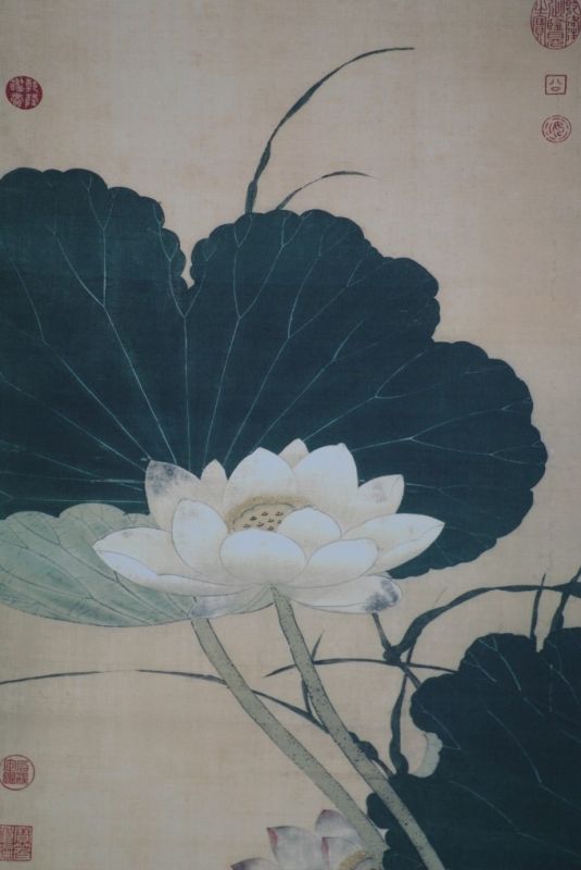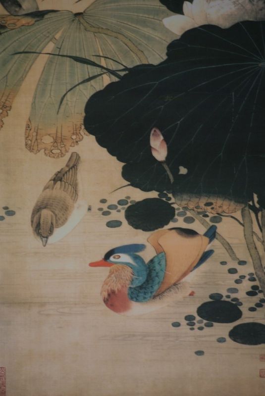 - Cette peinture est particulière car il s'agit d'une peinture réalisée sur un tissu type soie. (et non du papier de riz) le tout est ensuite monté sur un papier cartonné.