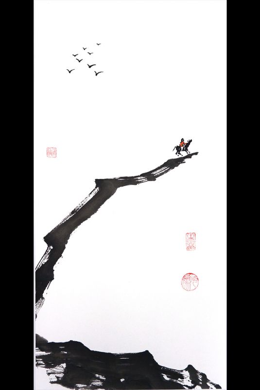 En soi, la technique pour utiliser un pinceau n’est pas difficile. Ce qui est compliqué, c’est l’art d’appliquer l’encre ou la peinture au bon endroit avec le bon mouvement afin de créer des paysages ou l’illusion de l’espace sur le papier. Comme l’encre est indélébile, tout tracé est définitif et aucune correction n’est possible. De plus, le papier possède un pouvoir absorbant qui ne tolère aucune hésitation de la part de l’artiste. Par conséquent, ses gestes doivent être précis et rapides, et il doit avoir son schéma complet en tête avant de commencer son œuvre. Nos artistes, 清雅 « Qīngyǎ » et son fils 易白 « Yìbái », utilisent une technique appelée « sumi-e » pour réaliser leurs œuvres. Cette technique est née en Chine et elle est également utilisée au Japon depuis le XIVe siècle. Elle est analogue à la technique de pinceau utilisée pour la calligraphie. D’ailleurs, pour parfaire leur technique, les peintres « sumi-e » s’exercent à la calligraphie afin de ne pas avoir à s’inquiéter de la composition et des couleurs.