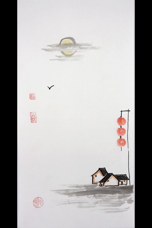 - Aquarelle sur papier de riz réalisée par l’artiste 清雅 « Qīngyǎ » et son fils 易白 « Yìbái ».