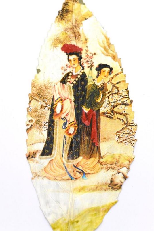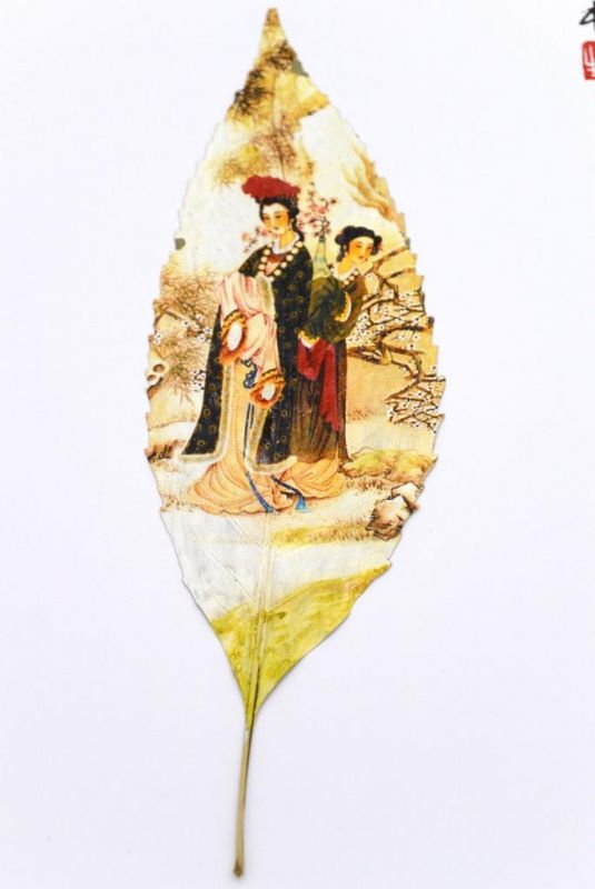 - Peinture chinoise realisée sur une feuille d'arbre.