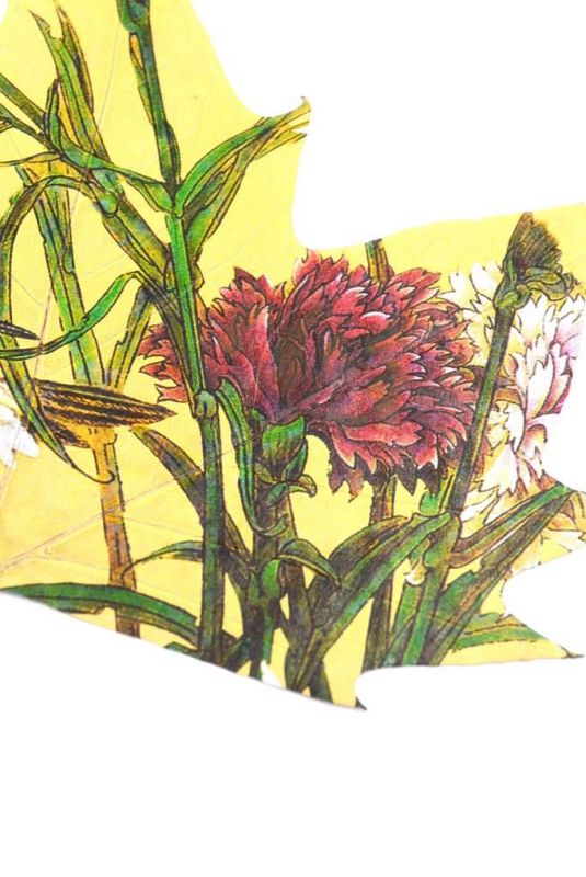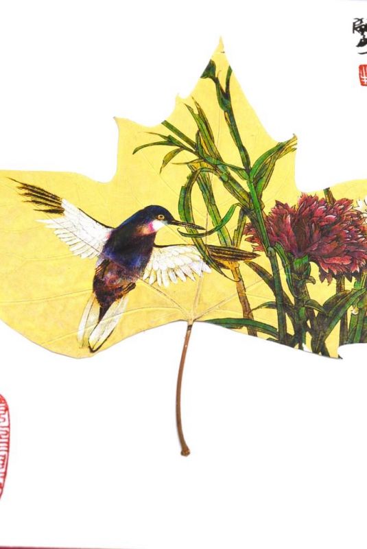 - Peinture chinoise realisée sur une feuille d'arbre.