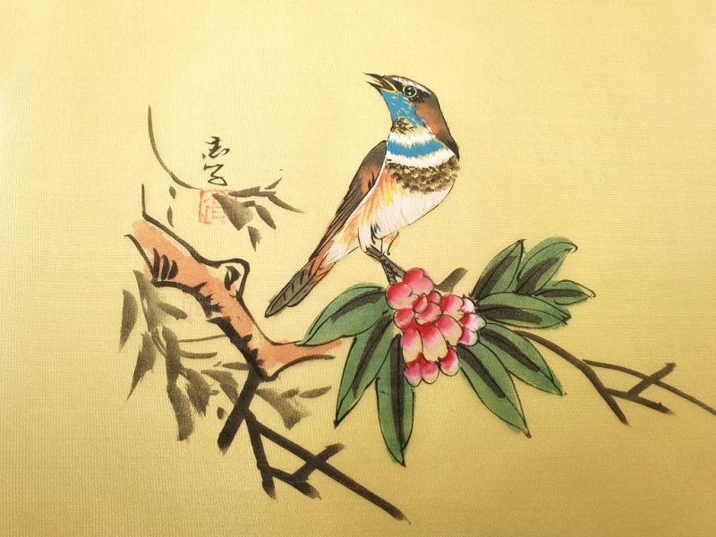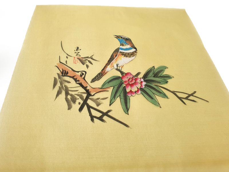 Peinture Chinoise sur soie à Encadrer - L'oiseau sur la fleur