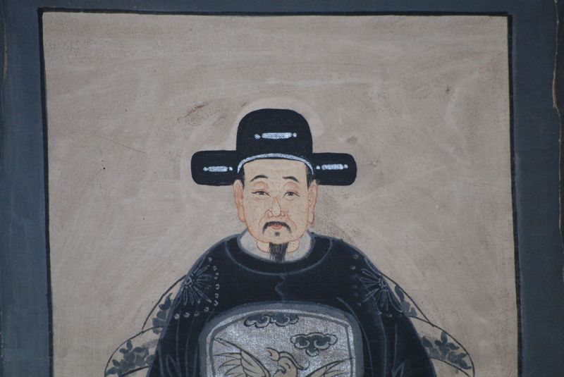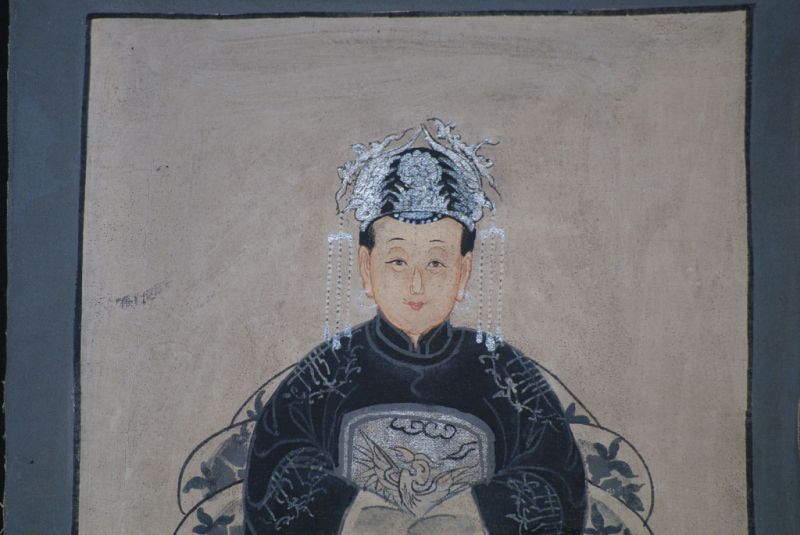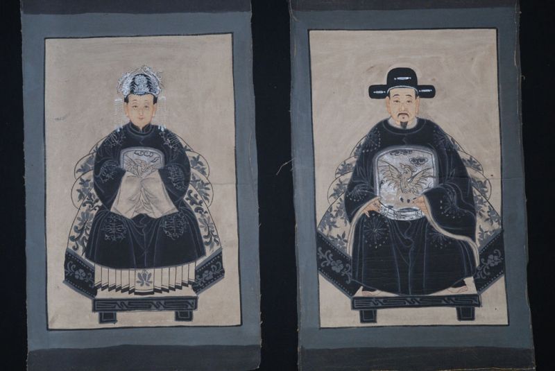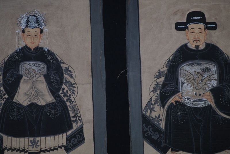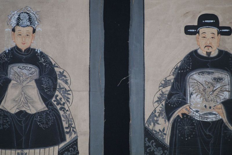 - Les portraits d’ancêtres chinois représentent une personne dans une posture immobile en tenue de fête (robe et chapeau de mandarin) ou en costume de dignitaire ou de fonctionnaire. Ils étaient réalisés par des artistes peintres jusqu’à l’arrivée de la photographie, et les costumes devaient être en rapport avec le rang social de la personne. Ces costumes diffèrent également en fonction des époques, des dynasties et des grades.