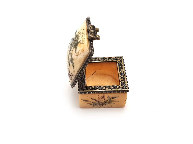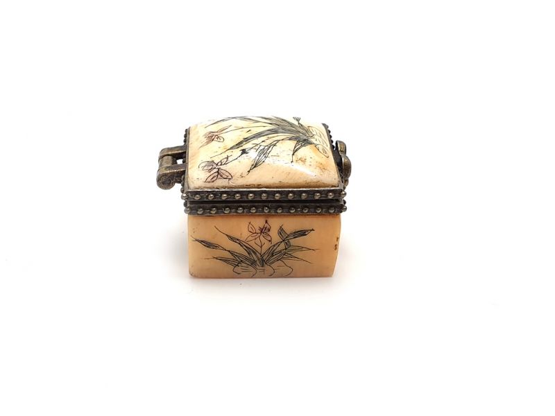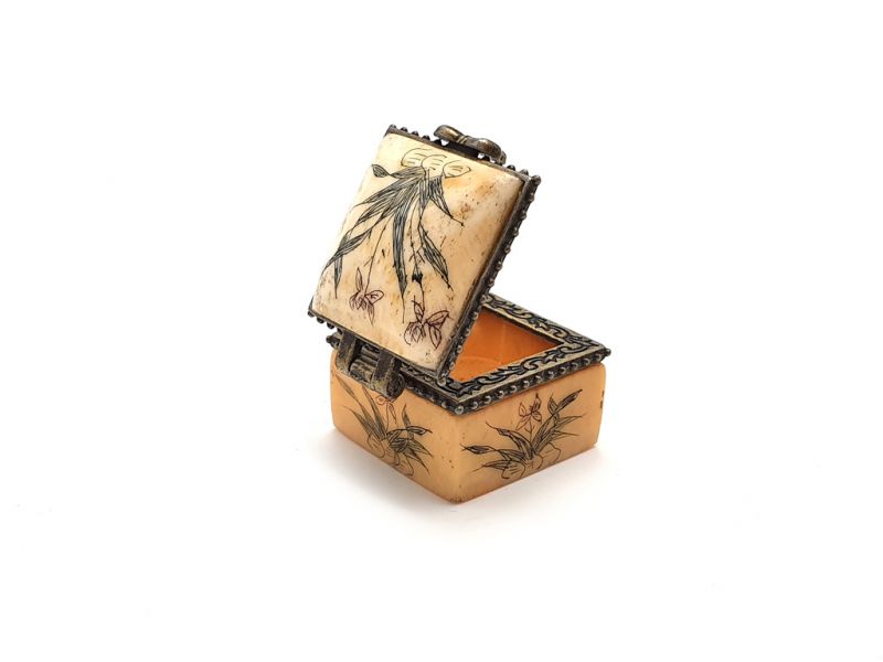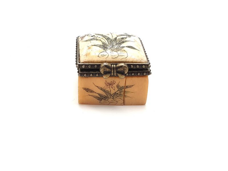 - Cette Boite est en OS (Os de Buffle) et est entièrement gravée, taillée et peinte à la main.