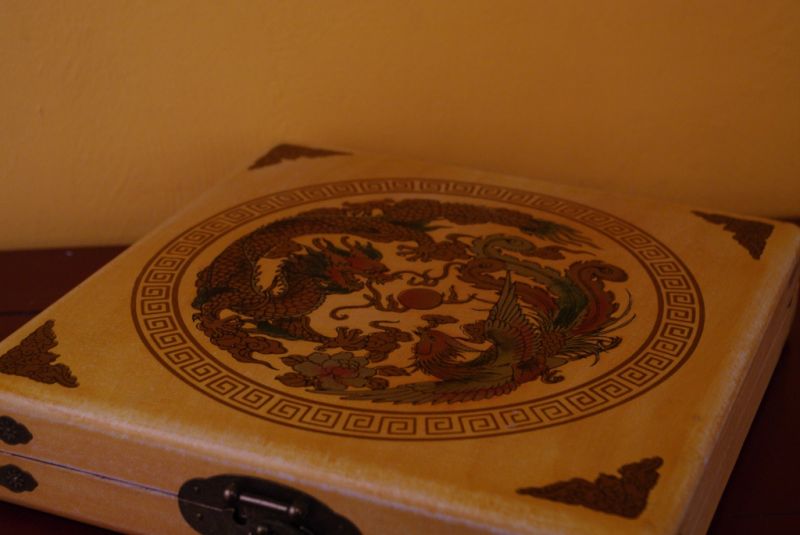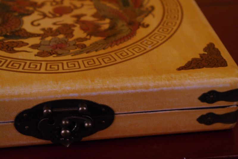 Le coffret est bois recouvert d’une fine couche de cuir végétal (imitation cuir) qui lui donne un style ancien avec des décorations oiseaux, dragon, phénix…