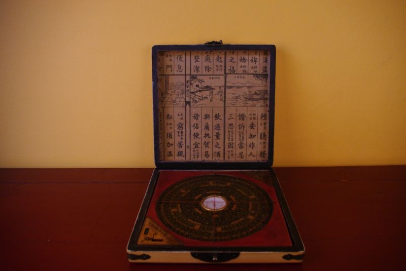 - Il s’agit ici d’une boussole chinoise (classique) appelée Luopan, en plus l’aiguille magnétique elle est pourvue de cercles concentriques qui la transforme en véritable règle à calcul.