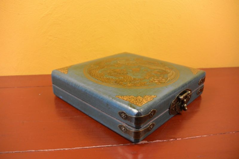 Le coffret est bois recouvert d’une fine couche de cuir végétal (imitation cuir) qui lui donne un style ancien avec des décorations oiseaux, dragon, phénix…