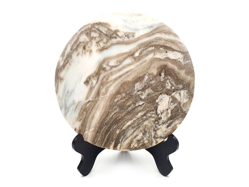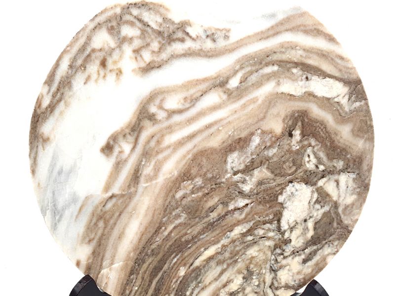 - Plaque circulaire en marbre dont les veinures naturelles évoquent un paysage dans l'esprit de la tradition classique chinoise.