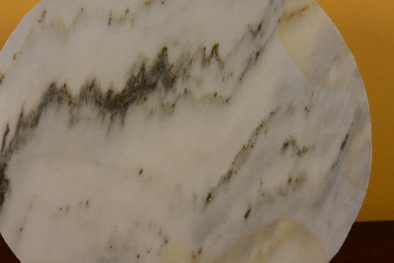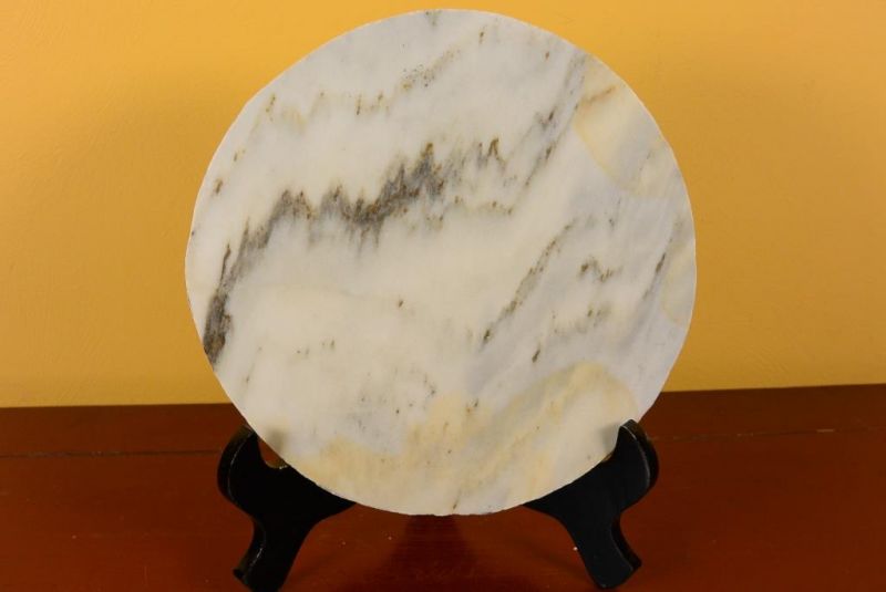 - Plaque circulaire en marbre dont les veinures naturelles évoquent un paysage dans l'esprit de la tradition classique chinoise.