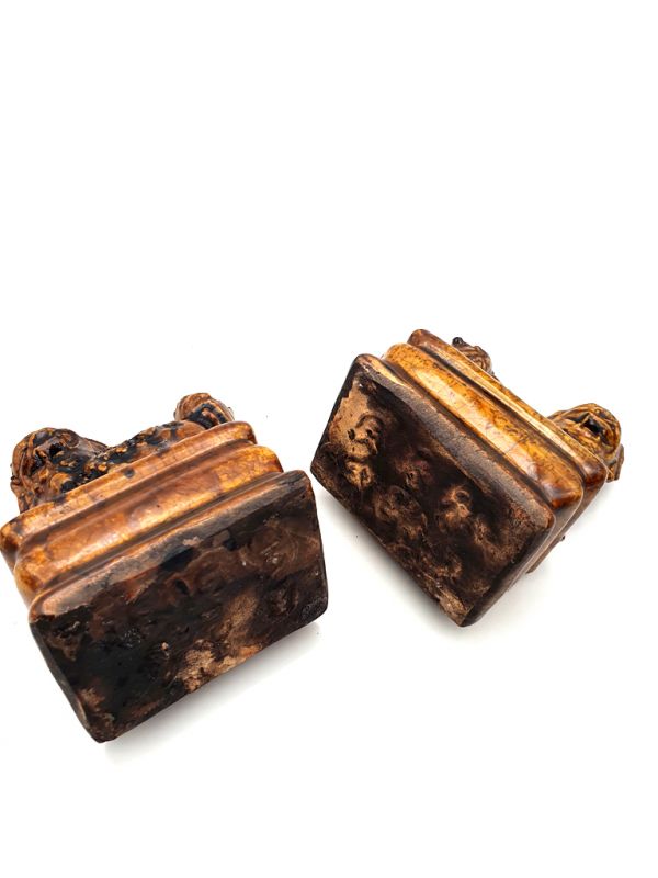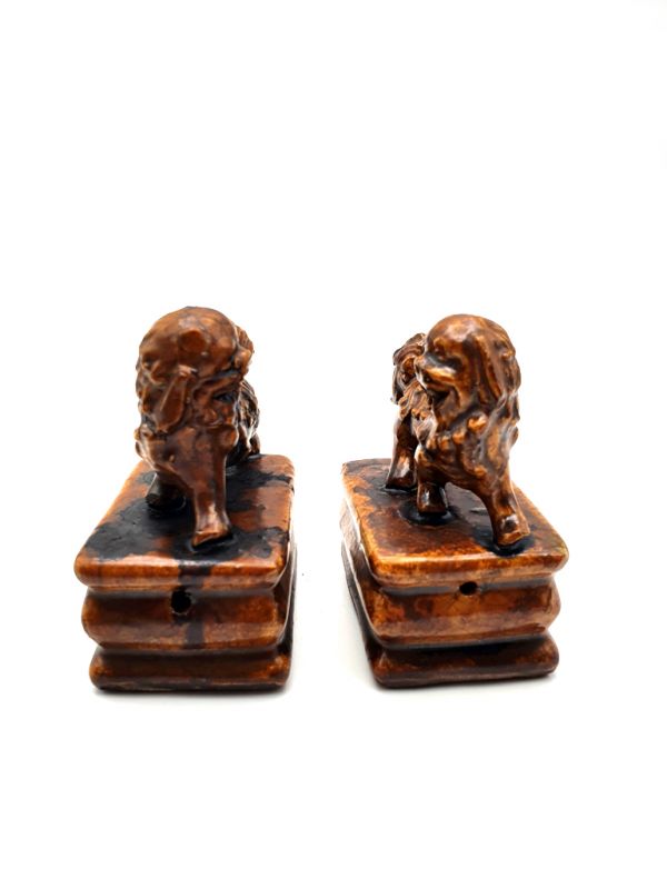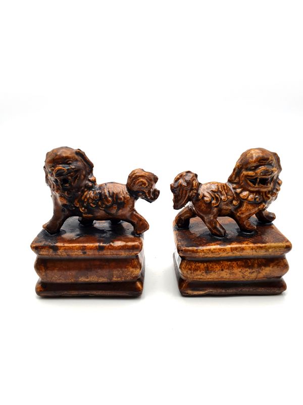 - Paire de Chiens FO, appelés aussi Chiens Fu ou lions chinois en porcelaine, animaux protecteurs selon la Loi de Bouddha. - Le Chien Fu est un animal légendaire qui repousse les esprits malfaisants. Les lions chinois sont toujours représentés par paire, la femelle est accompagné d'un lionceau (sous sa patte) quand au mâle il joue avec un globe (une balle / le monde). - Dans les temples bouddhistes chinois, le gardien de droite est toujours le mâle et celui de gauche la femelle. Ils sont placés au niveau de la porte de devant afin de protéger l'habitation ou le temple contre le Chi négatif.