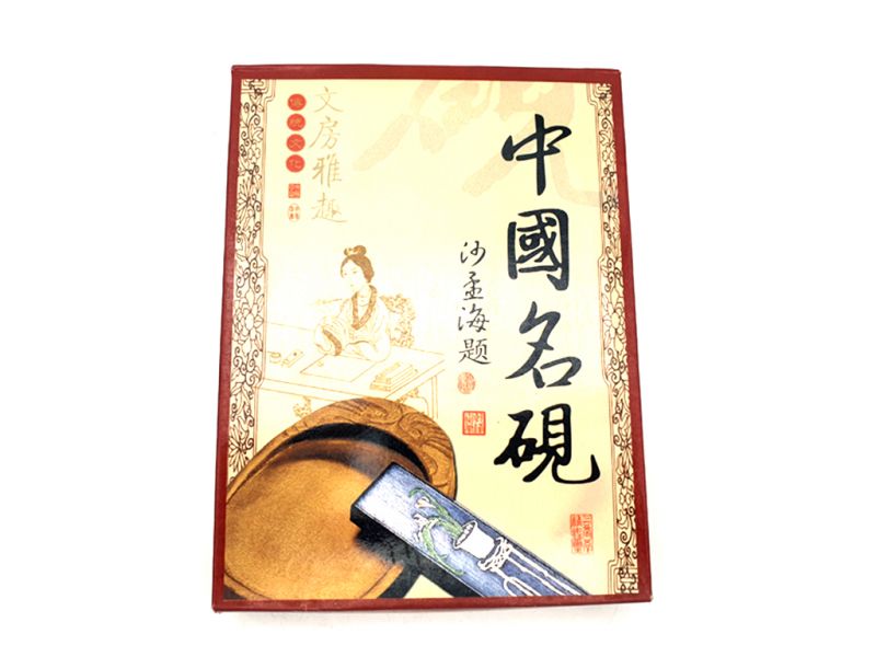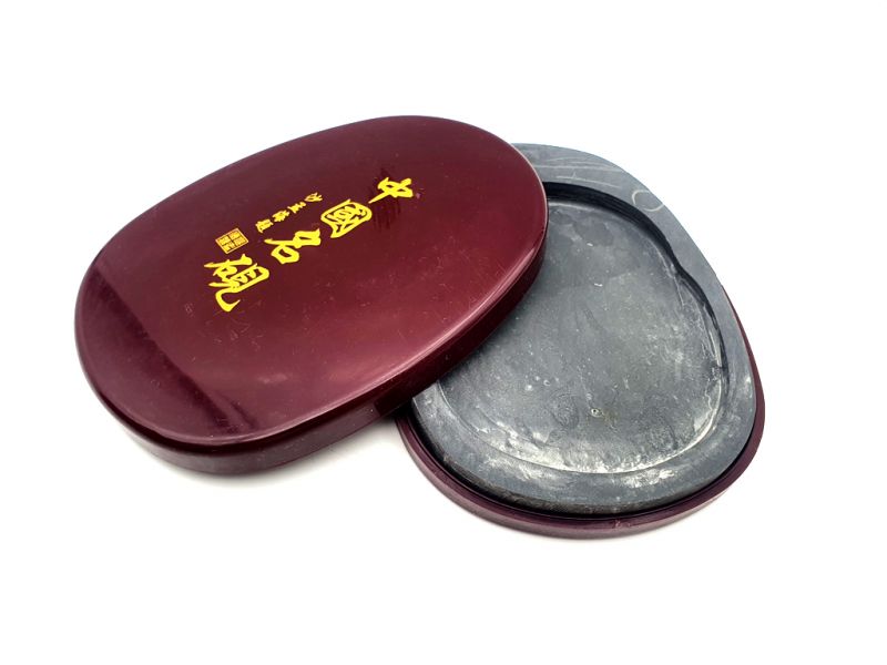 — Pierre à encre de Chine, sert à frotter les bâtons d'encre pour les diluer avec de l'eau. Ces pierres sont utilisées depuis des siècles en Chine et en Asie du Sud-Est. On les trouve dans des tailles et des formes variées, et elles peuvent être faites de matériaux tels que le jade, l'agate ou le verre. Elles sont généralement utilisées pour écrire des poèmes, des lettres et des dessins délicats, et peuvent être un moyen créatif d'expérimenter l'art de l'encre.