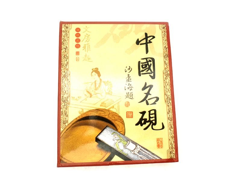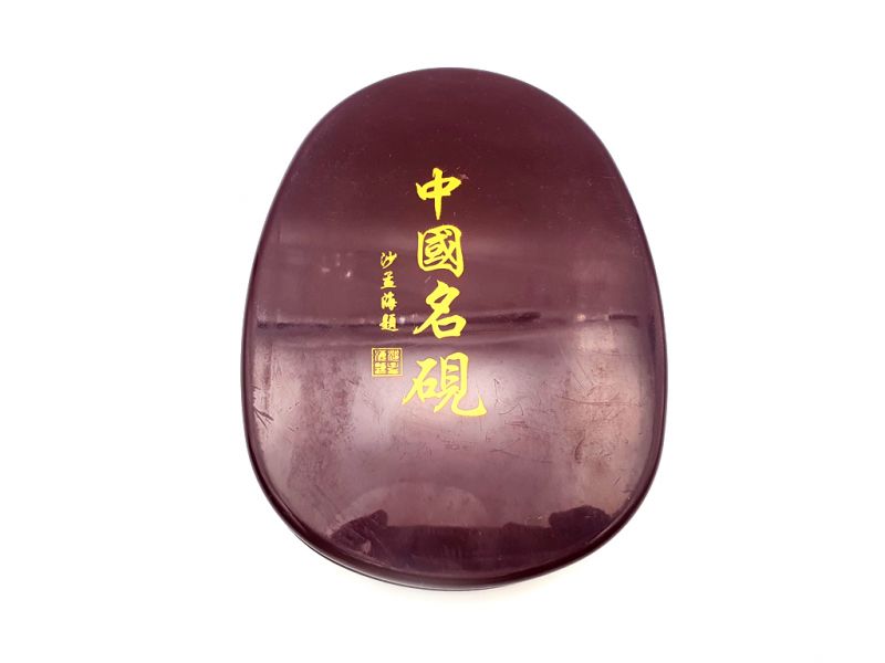 — Pierre à encre de Chine, sert à frotter les bâtons d'encre pour les diluer avec de l'eau. Ces pierres sont utilisées depuis des siècles en Chine et en Asie du Sud-Est. On les trouve dans des tailles et des formes variées, et elles peuvent être faites de matériaux tels que le jade, l'agate ou le verre. Elles sont généralement utilisées pour écrire des poèmes, des lettres et des dessins délicats, et peuvent être un moyen créatif d'expérimenter l'art de l'encre.