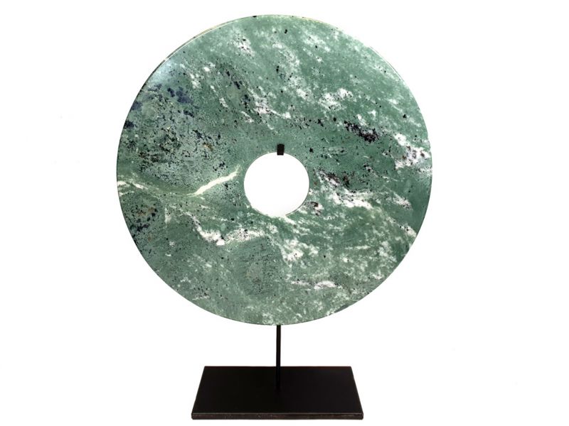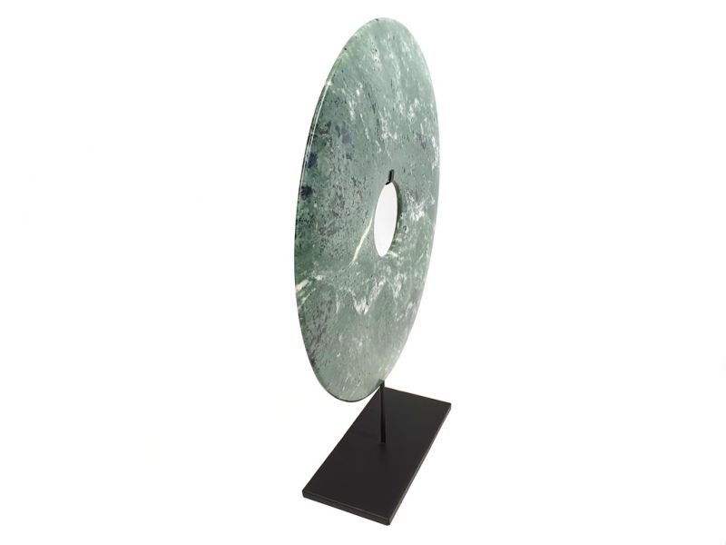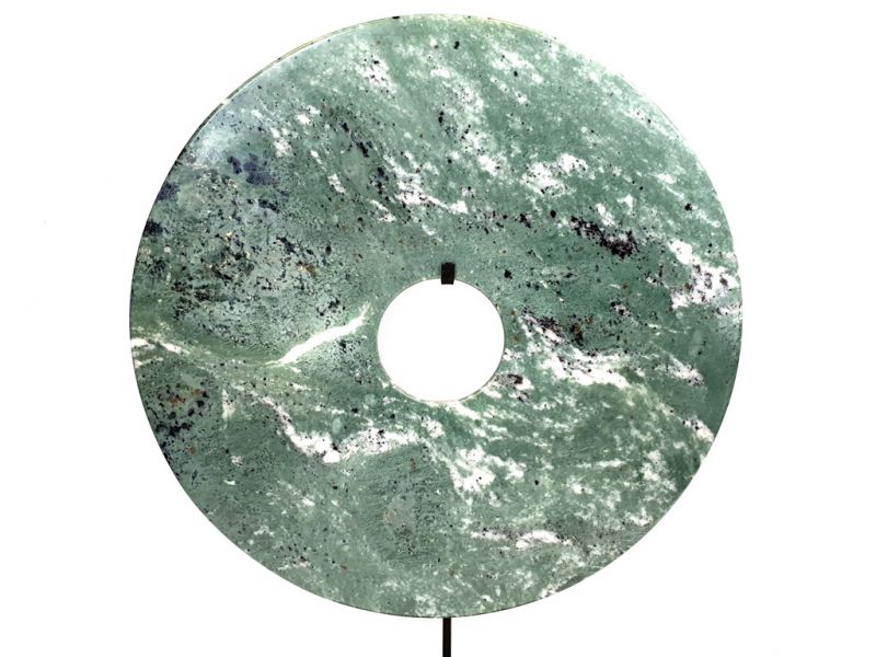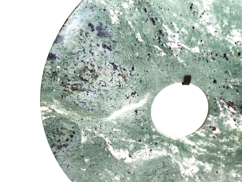 - Il représente le symbole de l’Univers céleste qui est comme lui rond et infini. C’est un artéfact en pierre de type marbre dolomitique opaque également appelé en Asie "Jade de montagne", Ce disque est de couleur naturelle. Il existe de nombreux gisements de Jade de montagne en Chine et cette pierre est utilisée depuis la Préhistoire par les Chinois dans la confection d’objets rituels, d’outils, d’objets artistiques et de potions médicinales.